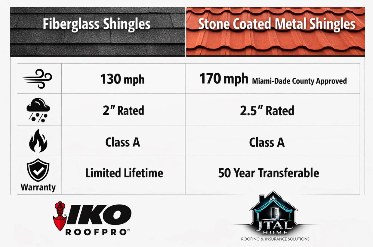 Did you know? Basic 3-Tab and architectural shingles are typically rated for about 60–70 mph winds and last around 15–20 years, while Fiberglass shingles can handle 110–130 mph winds and last 25–30 years! Premium One-Time roofing systems like Stone-Coated Metal roofing can withstand winds up to 170 mph, larger hail impacts, and often carry transferable warranties up to 50 years, making them one of the most durable residential and commercial roofing options available and helping to avoid claims and ever increasing deductibles